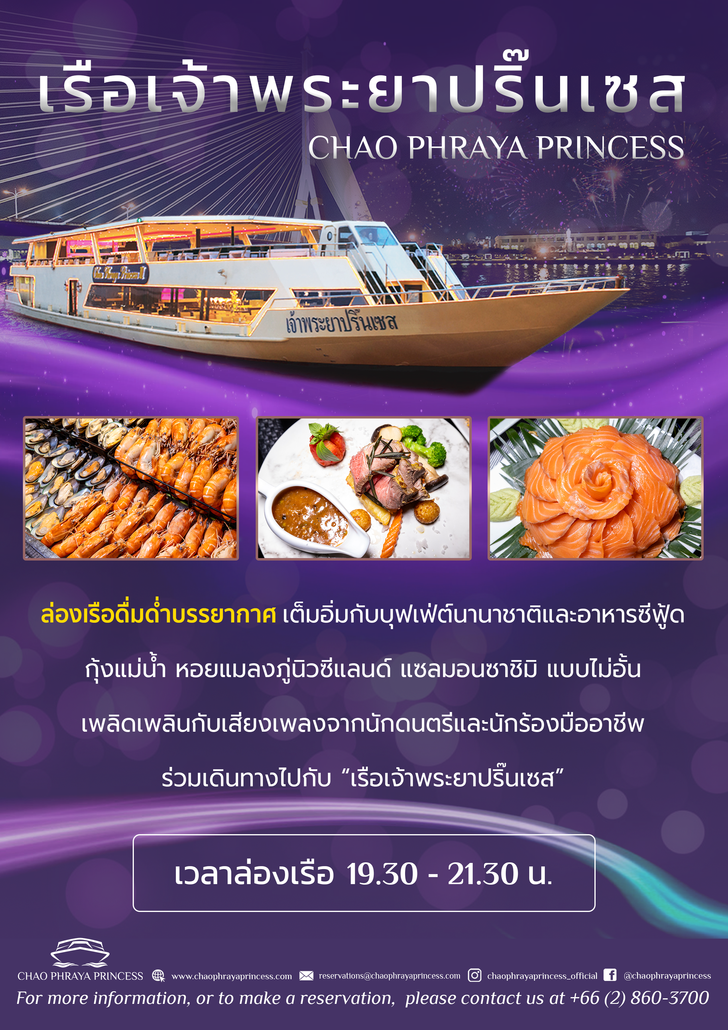 -ต้อนรับสู่เรือเจ้าพระยาปริ๊นเซส ด้วยบรรยากาศอบอุ่นเป็นกันเองกับเสียงแซกโซโฟน ตลอดระยะเวลาล่องเรือ 2 ชม. อิ่มอร่อยกับอาหารบุฟเฟ่ต์นานาชาติ เครื่องดื่มต้อนรับ น้ำเปล่า ชาร้อน กาแฟร้อน และการแสดงดนตรีสดจากนักร้องมืออาชีพ